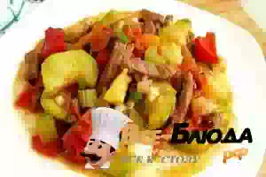 3. Разогреваем в сотейнике растительное мясо, обжариваем на нем лук и морковь, через пару минут добавляем порезанную кусочками отварную говядину, кабачки и болгарский перец. Можно влить немного воды. Также добавляем острый перец целиком и соль. Готовим, пока кабачки не станут мягкими и сочными.
