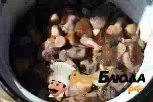 1. Моем грибы, чистим, режем и отвариваем в подсоленной воде, откидываем на дуршлаг.