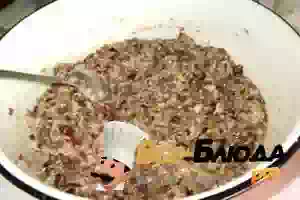 3. В грибной фарш добавляем яйца, измельченные овсяные хлопья, соль, перец. Все хорошо вымешиваем и оставляем на полчаса для набухания овсяных хлопьев.