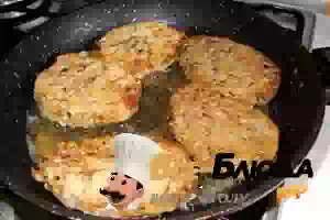 4. Из полученного фарша формируем котлеты, обваливаем их в панировочных сухарях и обжариваем на растительном масле с двух сторон до румяной корочки.