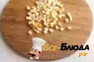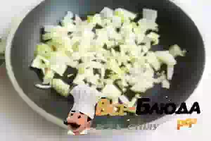 9. Приступаем к приготовлению гарнира. Лук мелко режем и обжариваем на подсолнечном масле.