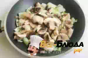 10. К луку кладем нарезанные пластинами шампиньоны и продолжаем обжаривать.