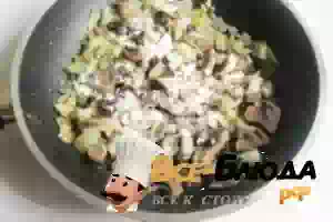 11. Через 7-10 минут лук с грибами посыпаем мукой. И хорошо перемешиваем.