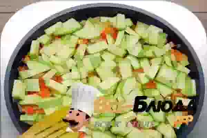 7. Всё перемешать и выложить сверху кабачок, не перемешивая. Накрыть крышкой и на слабом огне тушить овощное рагу 20 минут.
