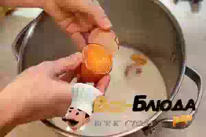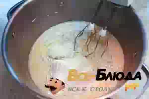 1. В посуде подходящего объема соединить яйца, молоко любой жирности, добавить сахар и соль. Обычным венчиком ил и миксером размешать до однородности.
