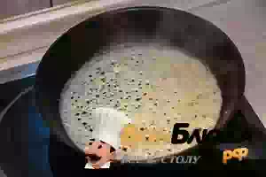 4. Быстро распределить тесто по сковороде и печь на среднем огне. Вы сразу увидите на тесте узор из дырочек. Как только поверхность теста слегка подсохнет, перевернуть блин и жарить с другой стороны. Готовые заварные блины на молоке переложить на тарелку, прикрыть их крышкой или другой тарелкой, чтобы оставались горячими. Подавать к столу со сметаной, мёдом или вареньем.