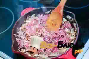 2. Для начинки пассеровать на растительном масле мелко нарезанный лук. Добавить мясной фарш и готовить, помешивая, до готовности. Приправить солью и молотым перцем. Добавить кусочек сливочного масла, чтобы начинка была сочнее.