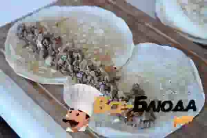 4. 2 маленьких блина положить внахлест и выложить на них начинку.