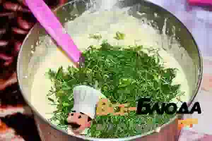 4. Зелень измельчить ножом, добавить в тесто. Перемешать все лопаточкой.