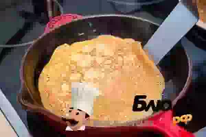 6. На сковороду налить немного растительного масла и хорошенько прогреть. После того уменьшить огонь до среднего или даже еще меньше, и налить ковшик теста. Быстро распределить его по дну сковороды и печь, наблюдая, как на поверхности блина появляется рисунок из дырочек. Перевернуть блин лопаткой и печь с другой стороны. Готовые заварные блины из ржаной муки на кефире стопочкой сложить на тарелку. Подавать со сметаной или с любой начинкой - сладкой или несладкой.