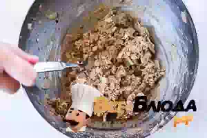 4. Смешать измельченную печенку с жареным луком и яйцом. Начинка готова.