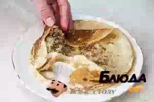 6. Подвернуть края и скрутить блин трубочкой. К горячим блинам с печенкой подать сметану.