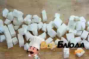 1. Замесить тесто для тонких блинчиков на кефире. Рецепт подробно описан здесь. Приготовить начинку для блинов. Рассольный сыр фета обсушить на бумажном полотенце и порезать маленькими кубиками.