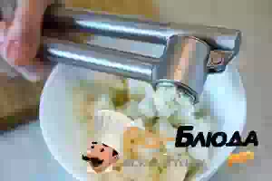 2. Сложить кубики феты в миску, полить растительным маслом, выдавить на сыр зубчик чеснока и добавить мелко нарезанную зелень. Аккуратно перемешать и убрать в сторону. Пусть сыр пропитывается ароматом и вкусом чеснока, пока вы будете готовить остальные продукты для начинки.