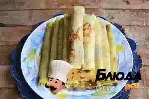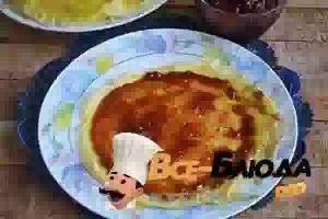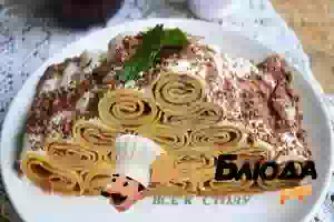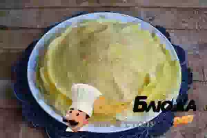 7. Для торта на блюдо выложить 5 блинов с начинкой. Затем на них уложить 4 блина.