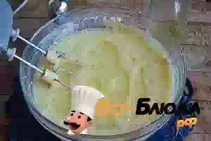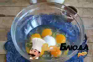 1. Приготовить тесто для тонких блинчиков. Для этого в глубокой емкости сначала смешать вилкой яйца и сахар. Затем тщательно взбить миксером до однородной массы. Влить половину молока и еще раз взбить.