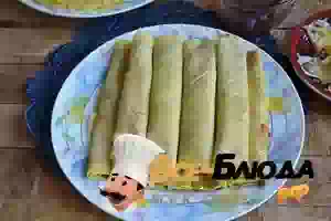 6. Скрутить блинчик и обрезать с дух сторон кончики без начинки. Так намазать и обрезать все блины.