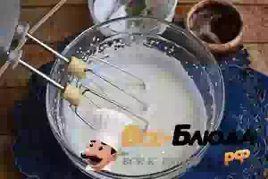9. Сверху блинный торт покрывают сметаной с сахаром. Для этого сметану и сахар взбивать миксером до однородной массы около 3 минут.