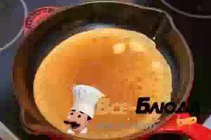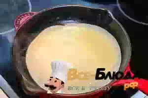 6. Через 30 минут сковороду хорошо нагреть, смазать маслом, перемешать блинное тесто венчиком и вылить на сковороду примерно половину половника стандартного размера.