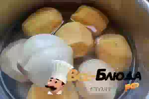 1. Картофель и лук очистить. Картофель порезать небольшими кусочками, чтобы удобнее было пропускать через мясорубку.