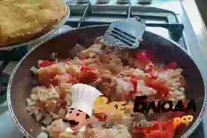 9. Продолжить приготовление мясной начинки. Для этого обжарить на разогретом масле мясной фарш вместе с мелко порезанным луком и сладким перцем.