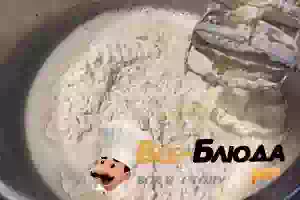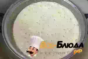 6. Всыпать муки столько, чтобы получилось тесто консистенции не очень густой сметаны. Те, кто любит толстые блины, могут добавить муки побольше и замесить более густое тесто. По желанию всыпать ванилин или ванильный сахар.