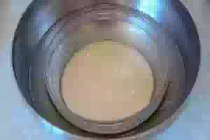 1. В 50 мл теплого молока развести свежие дрожжи с 1 ст.л. сахара. Миску с опарой поставить в посуду с теплой водой, затянуть пленкой и оставить для подъема. Если используете для теста сухие дрожжи, обязательно прочитайте инструкцию: есть дрожжи, которые смешивают с мукой, а другие - разводят в жидкости.