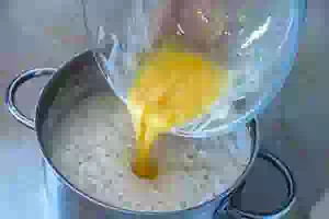 5. После расстойки добавить в тесто яйца, соль, 2 ст.л. сахара. Будет проще примешать яйца, если предварительно размешать их венчиком в отдельной миске.