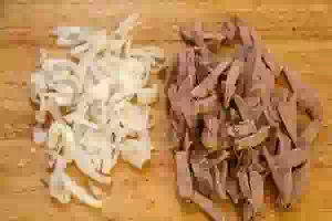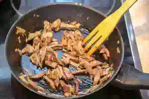 1. Для припека заранее сварить свиные языки в подсоленной воде. Вареный язык очистить и нарезать соломкой. Примерно так же порубить лук.