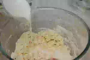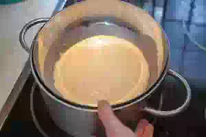 3. Приготовить блинное тесто по любому рецепту. Я замесила простые дрожжевые блины. Для опары раскрошила свежие дрожжи в 500 мл теплого молока, добавила 1 ч.л. сахара, всыпала 200-250г муки и размешала, чтобы не осталось комков. Если дрожжи сухие, то смешайте их сначала с мукой, а потом разбавьте муку молоком и добавьте сахар. Миску с опарой накрыла полотенцем и поставила в теплое место (в чуть теплую духовку или в бОльшую емкость с горячей водой). Оставила опару примерно на 20-30 минут, 1-2 раза перемешивала и ждала, когда её объем повторно увеличится в 2-3 раза.