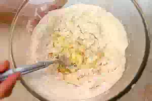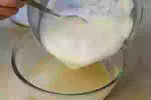 4. Желтки отделила от белков и смешала с растопленным сливочным маслом. Туда же добавила соль и сахар. Растерла просеянную муку с желтками.