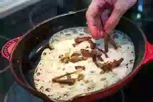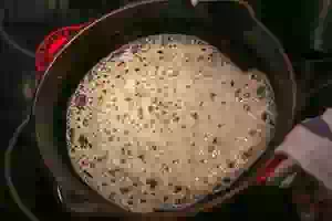 8. Как только на блине появятся дырочки, но тесто все еще будет липким, распределить по его поверхности припек.