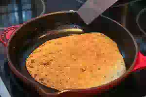 9. Дождаться, когда блин пропечется с нижней стороны, а на верхней тесто схватится. После этого лопаточкой перевернуть блин и жарить до готовности. Готовые блины с припеком из вареного языка с жареным луком складывать стопкой, чтобы они оставались горячими. Подавать к столу со сметаной или соусом по вкусу.