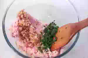 1. Заранее испечь блины по любому рецепту на сайте. В этот раз я пекла тонкие блины на кефире. Для начинки филе куриной грудки прокрутить через мясорубку, добавить жареный лук, посолить и поперчить. Влить для вязкости немного сливок (или молока) и хорошенько перемешать.