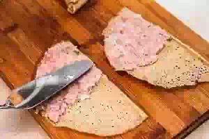2. Каждый блин разрезать пополам. На половинку половины блина уложить начинку слоем 5-7 мм.