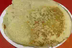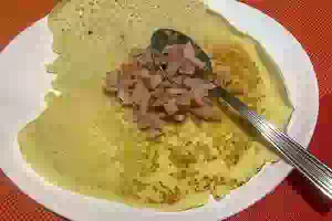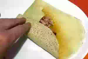 3. Разогреть сковороду, слегка смазать растительным маслом и налить немного теста, чтобы получился тонкий блинчик.
