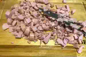 5. Приготовить начинку для блинов. Сосиски мелко порезать. Репчатый лук порубить маленькими кубиками.