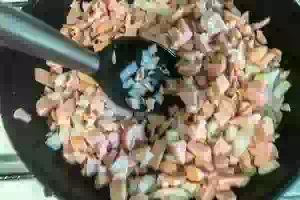 5. Приготовить начинку для блинов. Сосиски мелко порезать. Репчатый лук порубить маленькими кубиками.