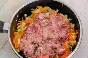 1. Сначала приготовим начинку. Морковку и лук почистим и нашинкуем достаточно мелко. Очищенную морковь лучше измельчить на средней или крупной терке. Перчик чили разрежем вдоль пополам, удалим семена и тоже мелко порежем. В сковороду нальем столовую ложку масла, разогреем его и добавим лук и морковь. Обжарим овощи пару минут и добавим фарш. Фарш лучше взять комбинированный из двух видов мяса - свинины и говядины. Если взять только свинину, будет жирновато, а фарш только из говядины будет суховат. Поэтому смешанный фарш будет в меру жирным и сочным.