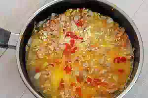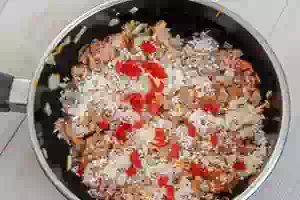 2. Минут через пять, когда мясо с овощами немного потушится, добавим в сковороду рис, перец чили и соль.