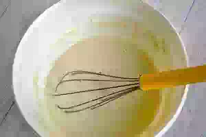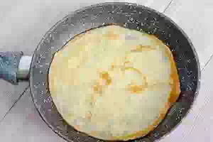 4. Пока начинка остывает, самое время заняться блинчиками. Из муки, яйца, молока, сахара и соли замесим жидкое тесто. Если получилось густовато, можно немного разбавить водой. Добавим в тесто немного растительного масла. Тесто должно быть жидким, хорошо растекаться по сковороде.