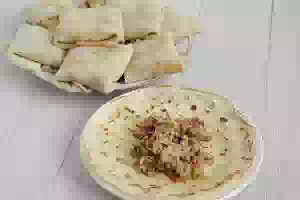 6. Когда блины немного остынут, их можно фаршировать. На середину блинчика положим начинку, (примерно столовую ложку) и завернем их конвертиком.
