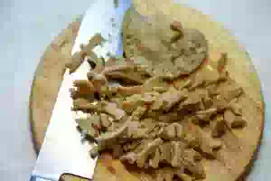 2. Для начинки подойдут любые соленые (или маринованные) грибы. У меня были маринованные грузди. Их надо промыть под проточной холодной водой, откинуть на дуршлаг, чтобы стекла вода, а затем порезать на небольшие кусочки.
