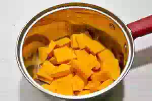 1. Приготовление блинчиков следует начать с приготовления тыквенного пюре. Очищенную от кожуры, мякоти и семечек тыкву нарежьте некрупными кусочками, сложите в сотейник и влейте воду, чтобы она только покрывала тыкву. Сварите тыкву до мягкости при слабом кипении.