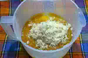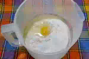3. В миску для теста просейте пшеничную муку, разбейте одно яйцо, всыпьте соль и сахар.