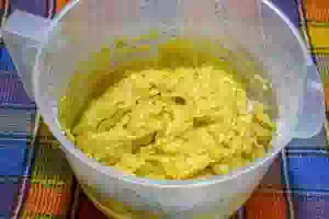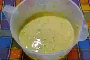 6. Вливайте порциями теплую воду до нужной консистенции блинного теста и миксером перемешайте смесь, чтобы не осталось комочков муки. Влейте растительное масло в миску и еще раз размешайте. Отставьте тесто в сторону хотя бы на полчаса, чтобы клейковина набухла.