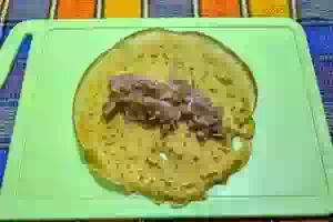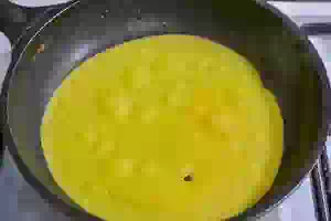 7. Сковороду хорошо разогрейте. Для выпечки первого блинчика смажьте сковороду маслом и вылейте порцию теста. Вращайте сковороду так, чтобы тесто равномерно расплылось по всей поверхности. На поверхности блинчика появились дырочки, аккуратно переверните его. Обжаривайте на умеренном огне до готовности. Испеките все блинчики.