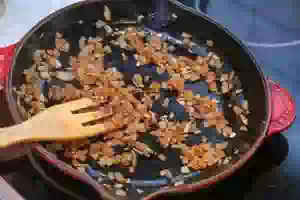 2. Для начинки мелко нарезать лук и подрумянить его на растительном масле.
