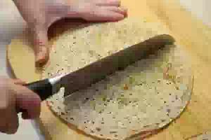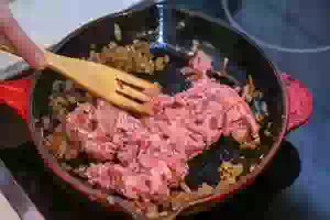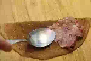 8. На край начинки положить 2 ст.л. сырого мясного фарша с жареным луком.