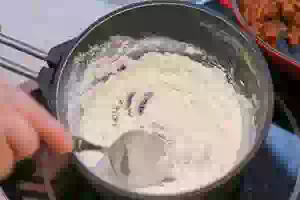 4. Для блинной запеканки будет готовить соус бешамель, но не обычный, а с сыром. Для начала в небольшом сотейнике надо растопить сливочное масло. Следом всыпать муку, и непрерывно помешивая венчиком, лопаткой или обычной ложкой, прогреть муку, пока она слегка не подрумянится и не начнет вкусно пахнуть. Обычно этот завах называют ореховым.